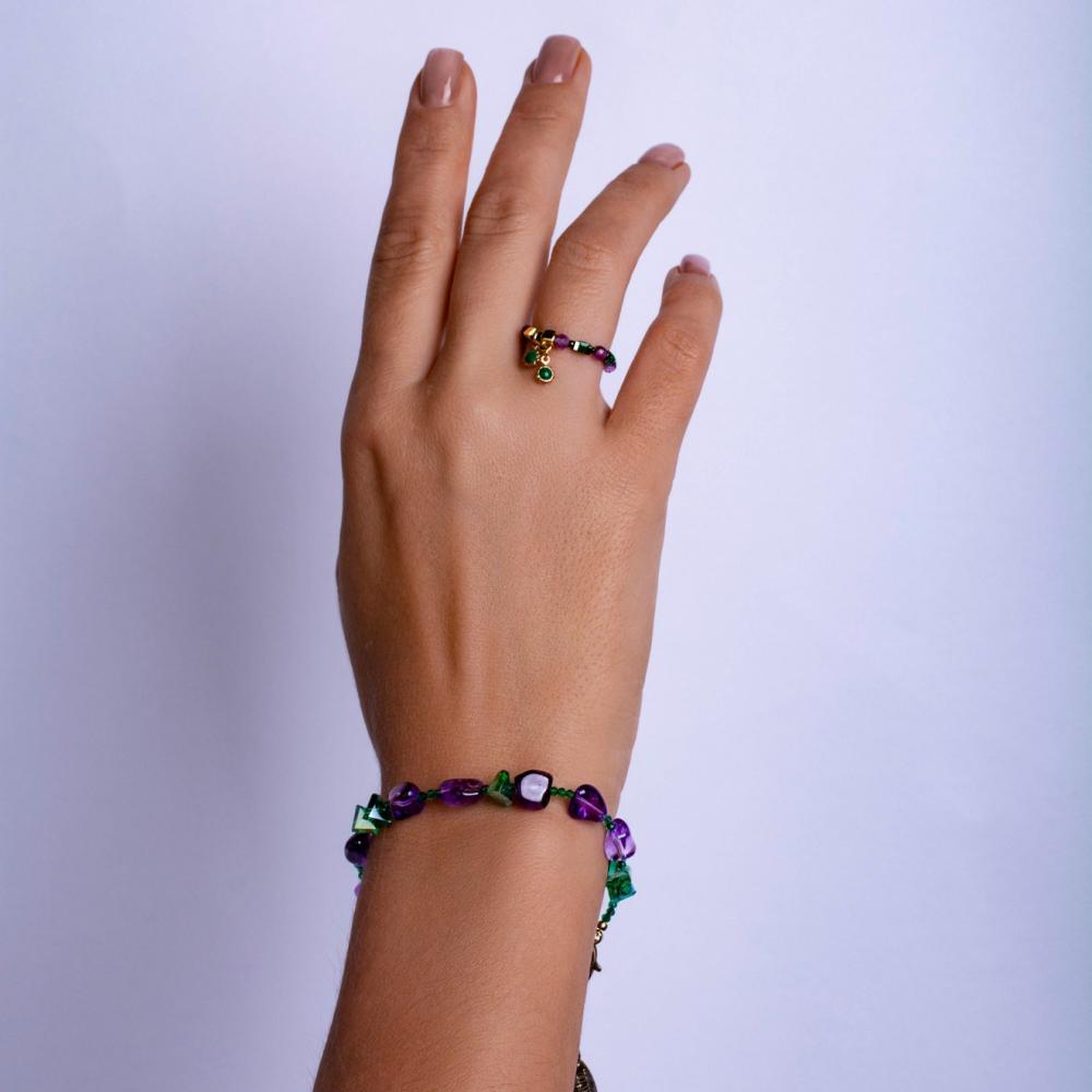 Центральное место в дизайне занимают вставки из натурального аметиста и сверкающих кристаллов. Аметист — это камень не только красивый, но и имеющий долгую историю как символ спокойствия и мудрости. В сочетании с блестящими кристаллами он создает игру света и цвета, привлекая восхищенные взгляды.