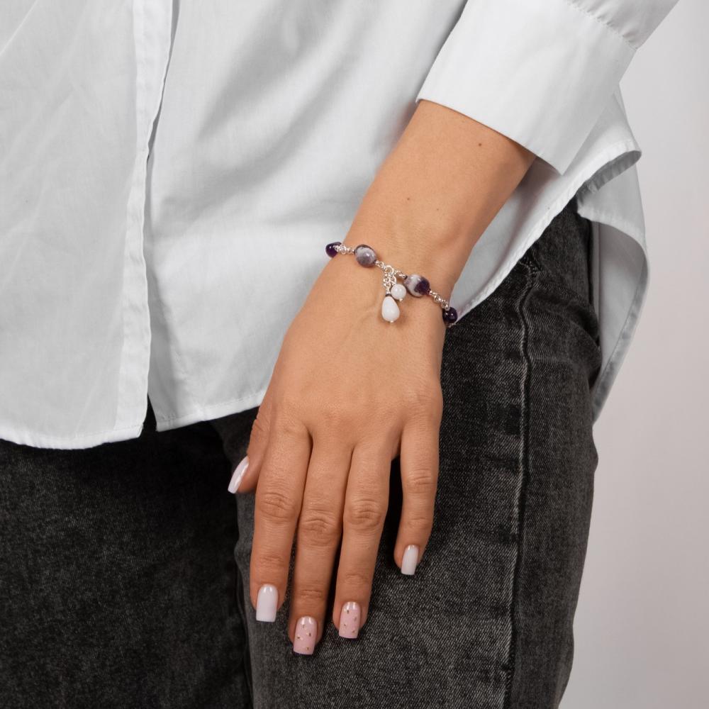 Откройте для себя великолепие и изысканность итальянской бижутерии с браслетом Glicine, украшенным белым агатом, аметистом, гематитом и лунным камнем. Этот браслет несет в себе сочетание благородства и загадочности, идеально подходящее для любого случая.
