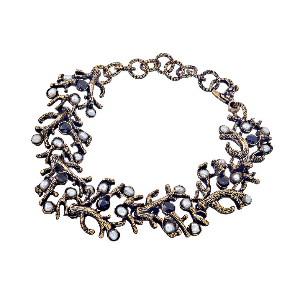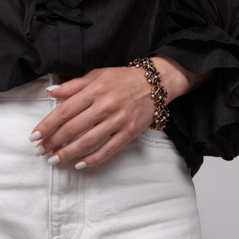 Браслет премиального класса. Представляем вашему вниманию эксклюзивный браслет, который станет истинной жемчужиной вашей ювелирной коллекции. Это изысканное украшение украшено нежными жемчужинами и ослепительными сапфирами, создавая эффектный контраст и добавляя образу роскоши.