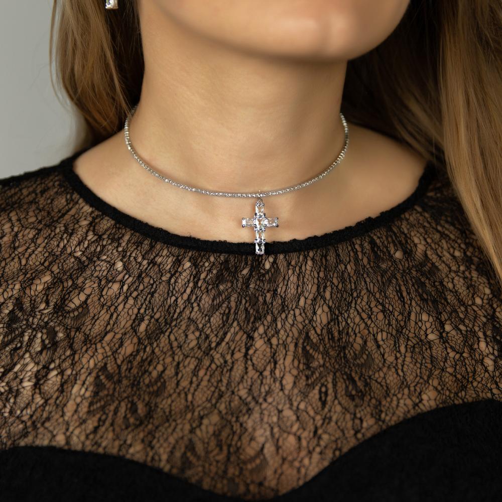 Дизайн колье включает в себя элегантный крест, украшенный яркими кристаллами, которые изящно переливаются на свету, привлекая восхищенные взгляды. Каждый элемент дизайна тщательно продуман, чтобы создать гармоничное украшение, которое подчеркивает вашу индивидуальность.