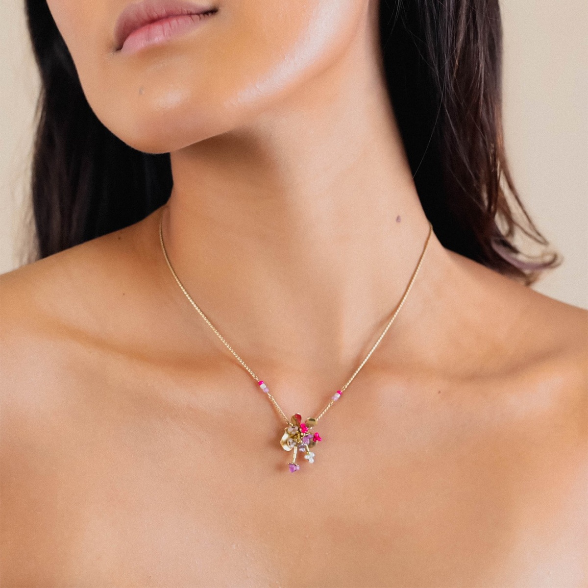 Центральный элемент колье — подвеска размером 2 см, украшенная цветным бисером. Благодаря мастерскому сочетанию оттенков бисера подвеска играет на свету и притягивает взгляды, добавляя образу игривости и шарма.