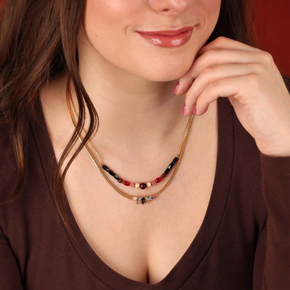 Вставки из цветной смолы добавляют кольцу особую привлекательность, создавая игру света и цвета на вашей шее. Золотая краска в сочетании со стеклянными бусинами и экзотическими бусинами хейши придает этому украшению неповторимый шик. Агат — натуральный полудрагоценный камень — используется в этом колье как главный акцент, который не только выглядит стильно, но и обладает многими положительными свойствами по верованиям любителей литотерапии.
