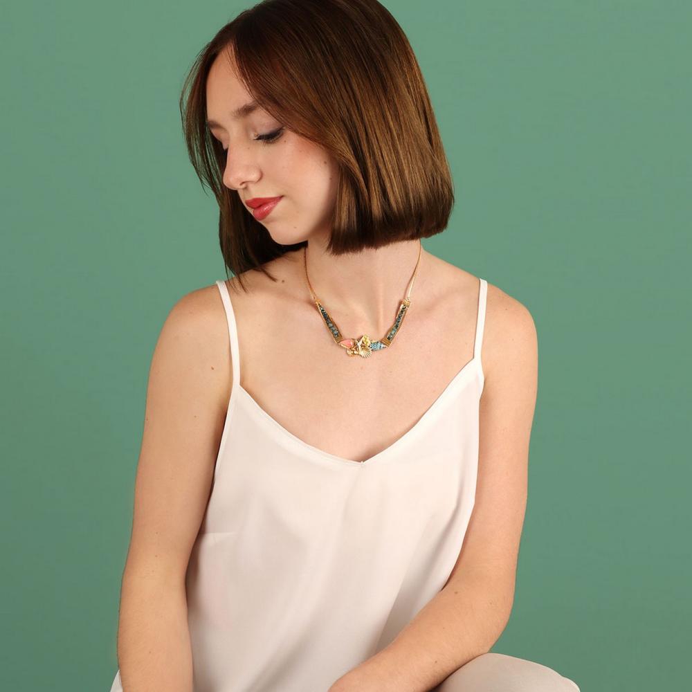 Особенностью данного украшения является использование цветной смолы, которая придает колье уникальную глубину и богатство оттенков. В сочетании со стеклянными бусинами различных форм и размеров, а также сверкающими стразами, колье Archipel притягивает взгляды своим блеском и оригинальностью.