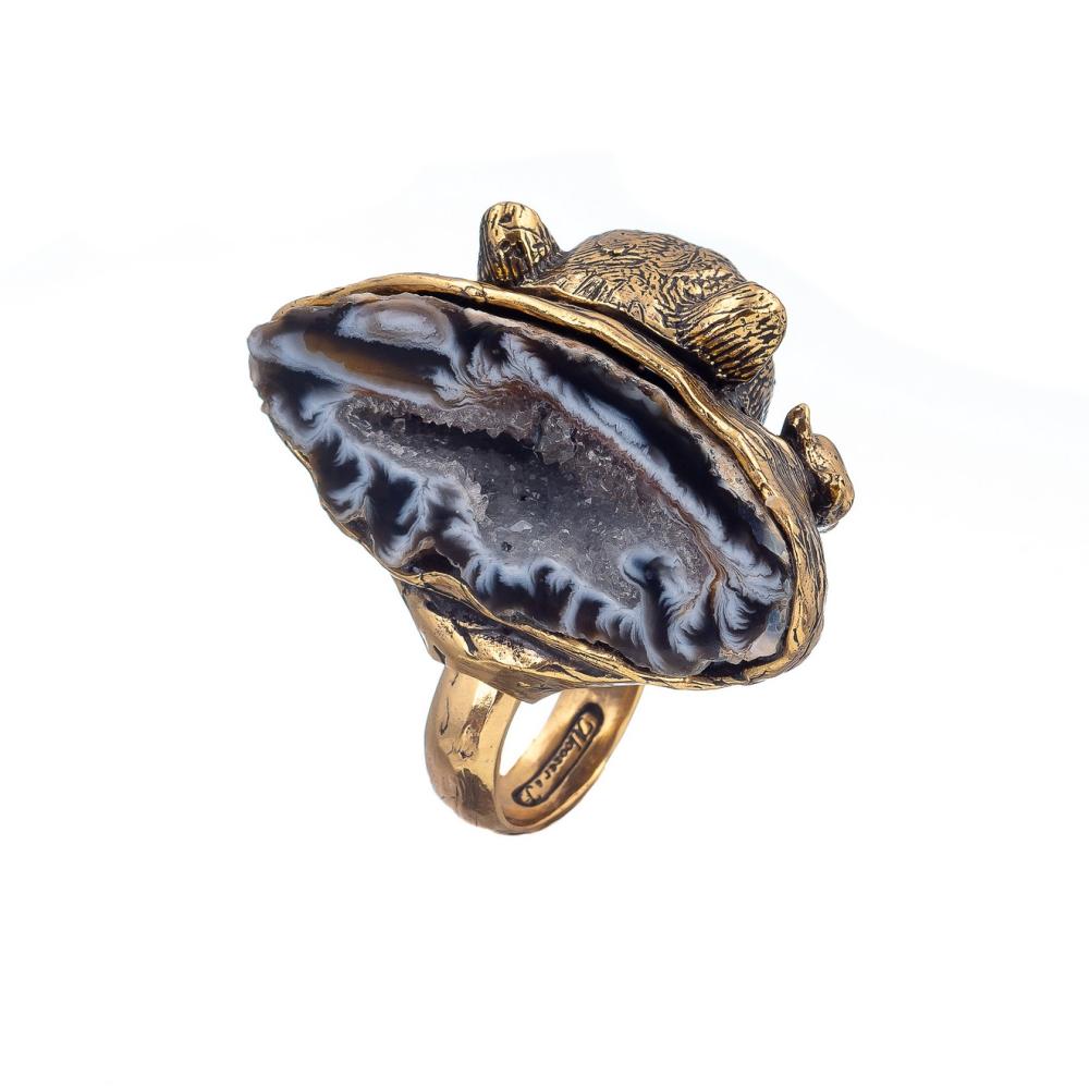 Дизайн кольца поражает своей оригинальностью: в центре изделия расположена уникальная друза агата — природный минерал, который формируется в пустотах горных пород и привлекает взгляды своей текстурой и неповторимым рисунком. Каждый агат уникален, что делает ваше кольцо по-настоящему единственным в своем роде.