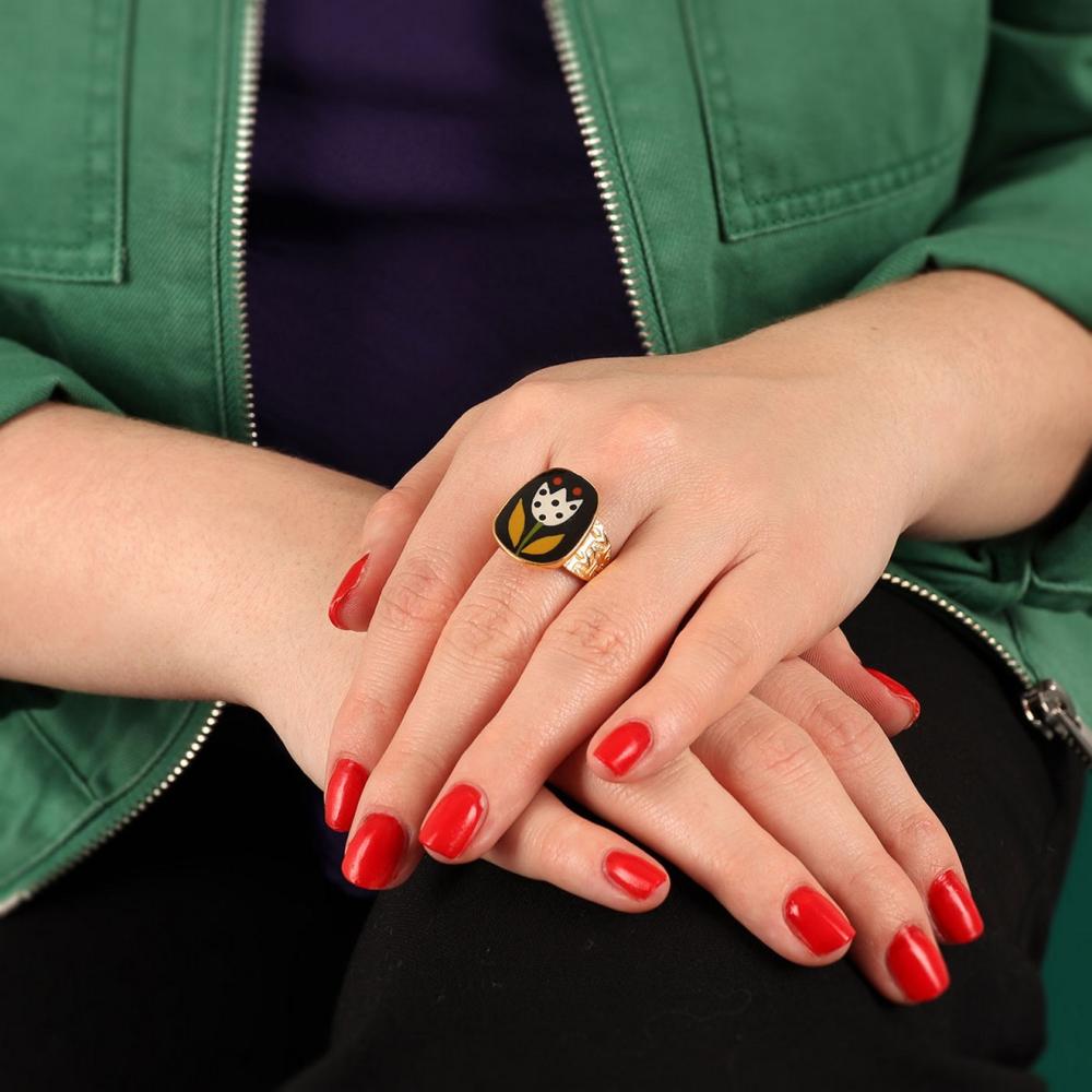 Вставка из цветной смолы имитирует драгоценные камни и создает эффектную игру света. Это не только украшает кольцо, но и делает его отличительным знаком коллекции Jeu De L`oie.