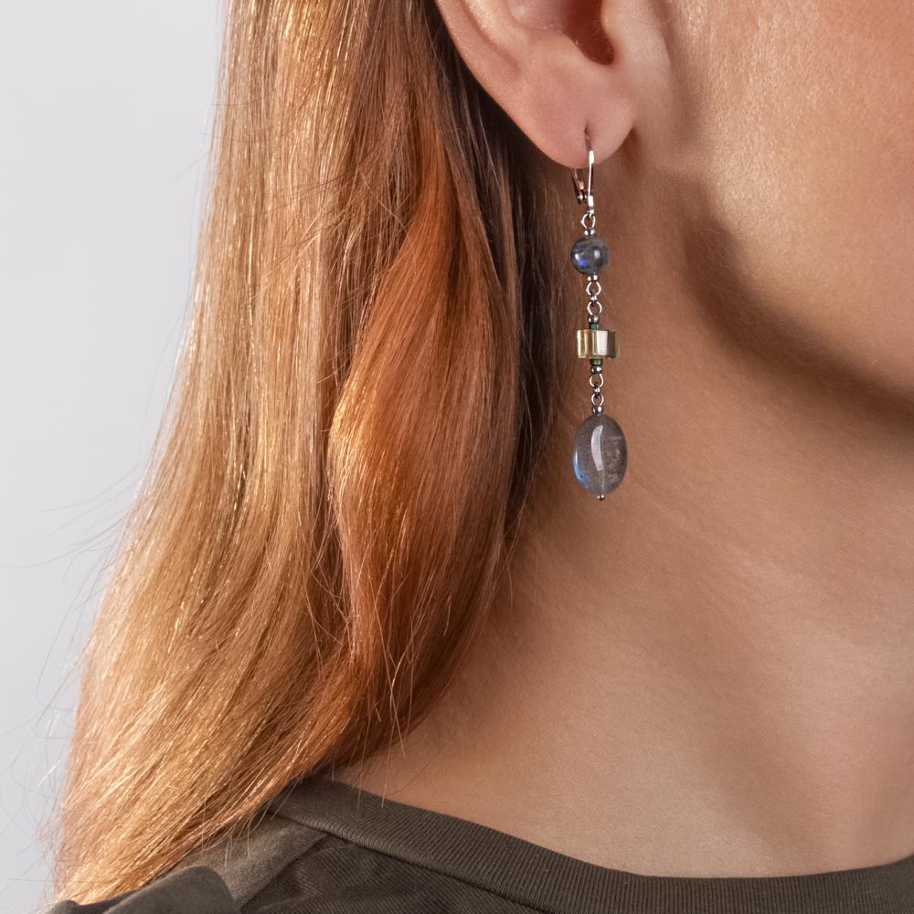 Эти элегантные серьги украшены тройным сочетанием вставок: загадочным лабрадоритом, блестящим гематитом и сверкающим цитрином. Лабрадорит известен своими переливчатыми оттенками, которые великолепно играют на свету и привносят глубину в общий дизайн украшения. Гематит добавляет акцентов благодаря своему металлическому блеску, а цитрин оживляет композицию теплыми золотистыми бликами.